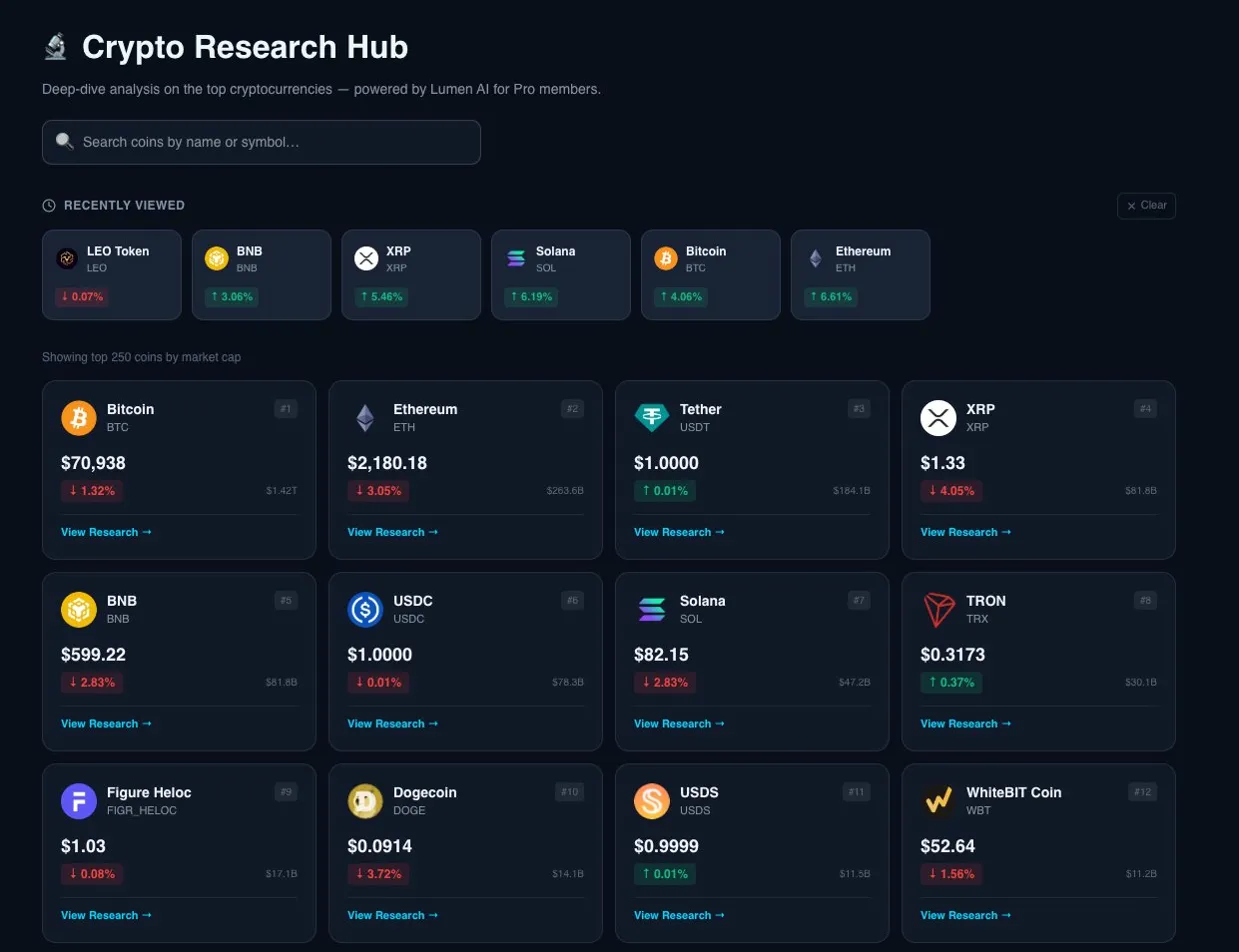 Lumen AI generates deep-dive analysis on 250+ coins covering price action, fundamentals, sentiment, risks, and TCG\u2019s honest stance.